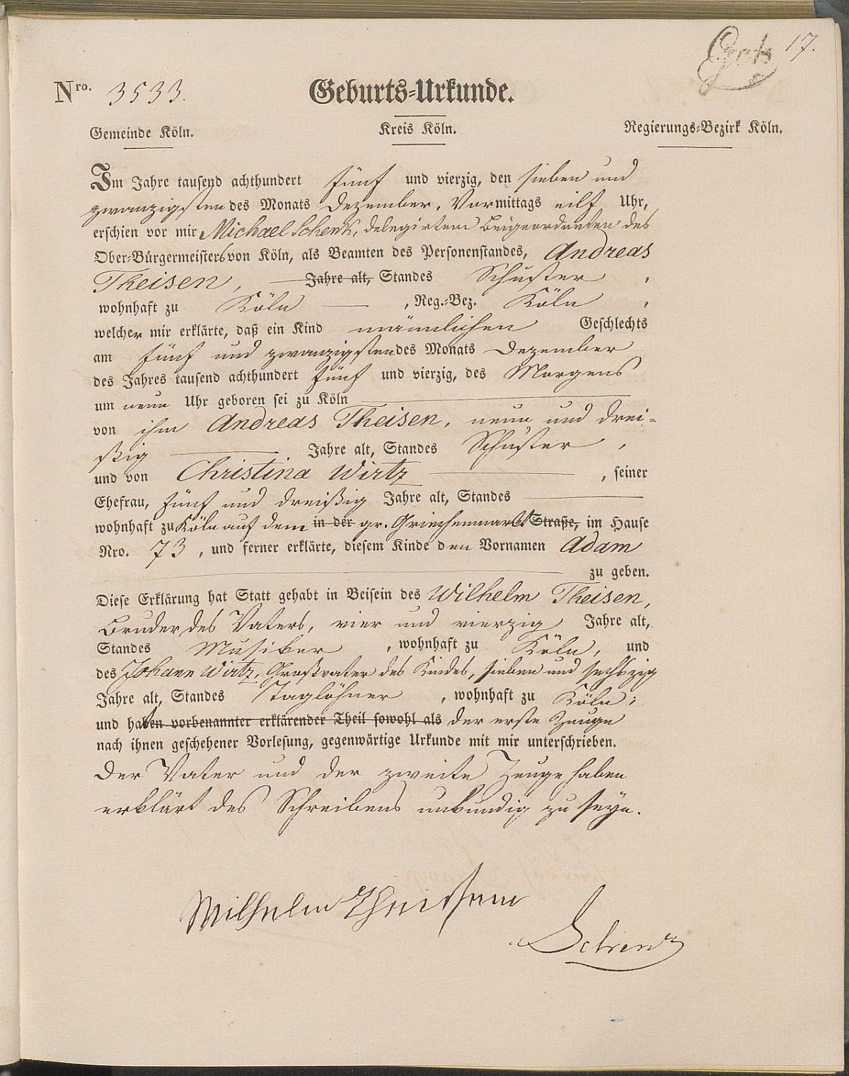 Quelle: Geburtsregister Nr. 3533/1847 Zivilstandsregister Köln