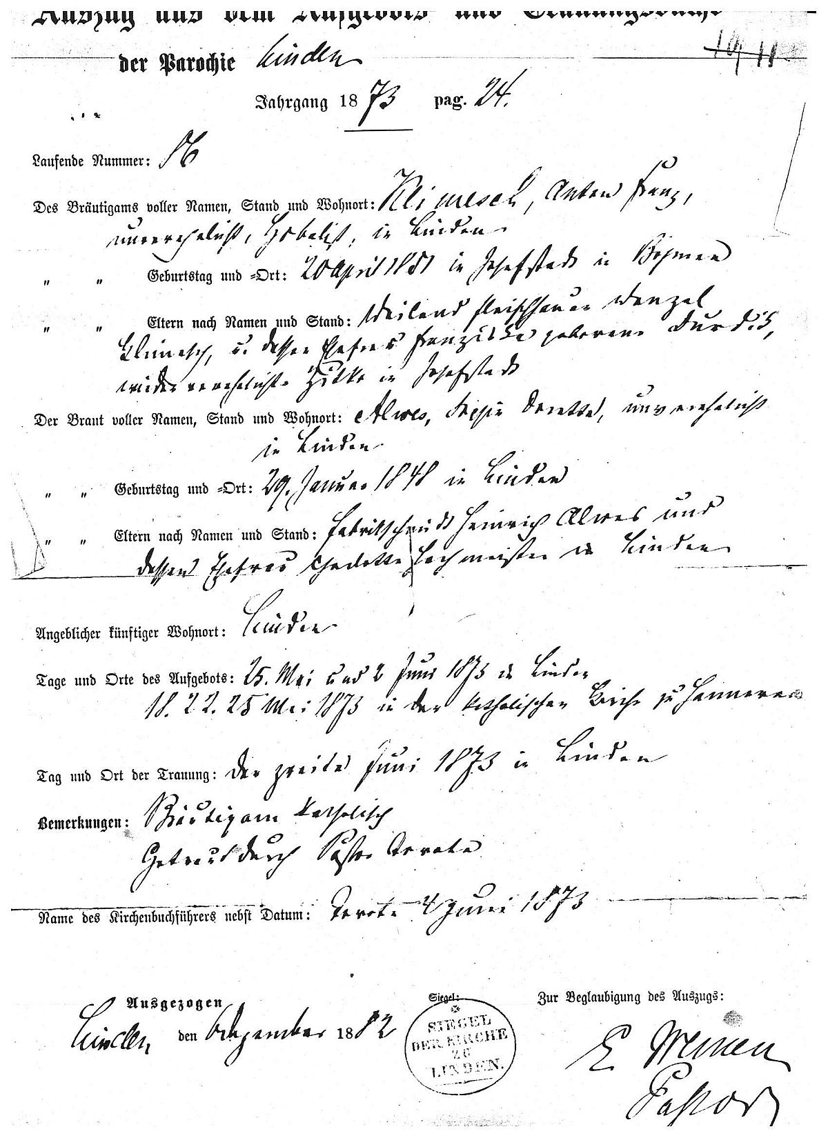 Quelle: Kirchliche Heiratsregister Seite 24 lfd. Nr. 86 Jahrgang 1873 Martinskirche (Hannover-)Linden.