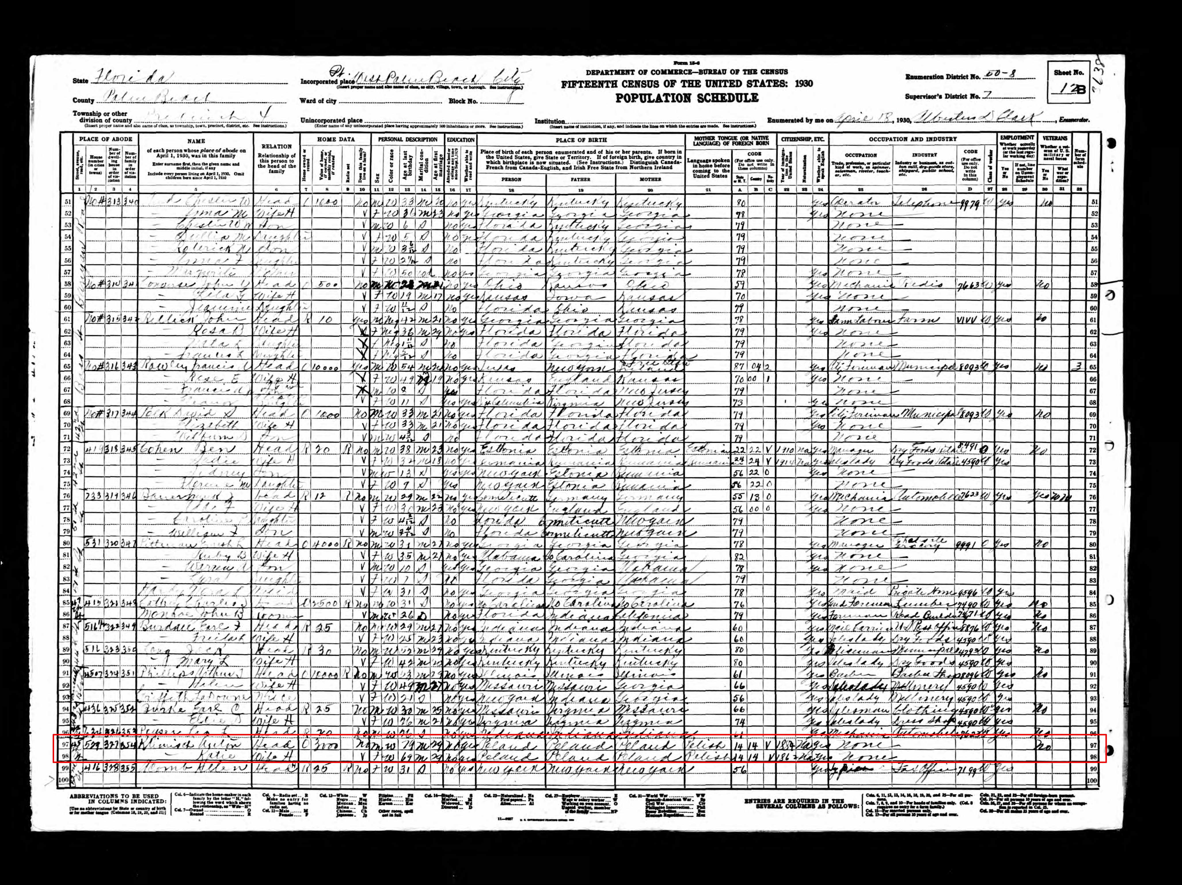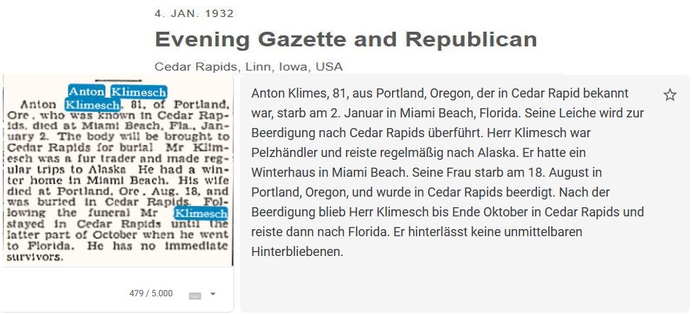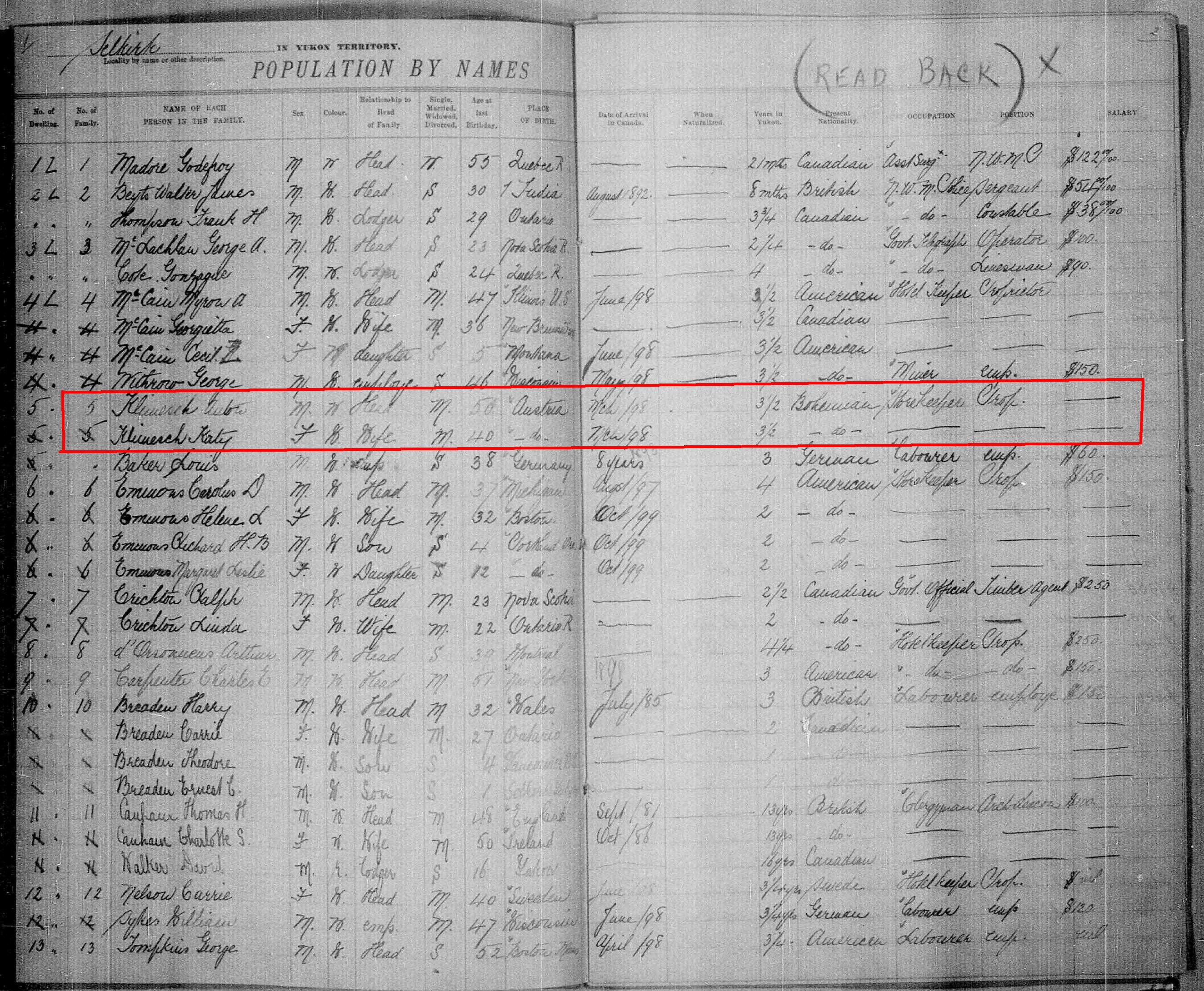 Ausgewandert über Philadelphia um 1882/1883, Census 1895 in Oregon - 1399 Mallory avenue, Portland. Census 1901 in Yukon Canada - vermutlich 1898 bis 1910 Dominion Hotel Fort Selkirk Gastwirt und Pelzhändler. Später Census 1920 und 1930 in Palm Beach - 529 44th Street.