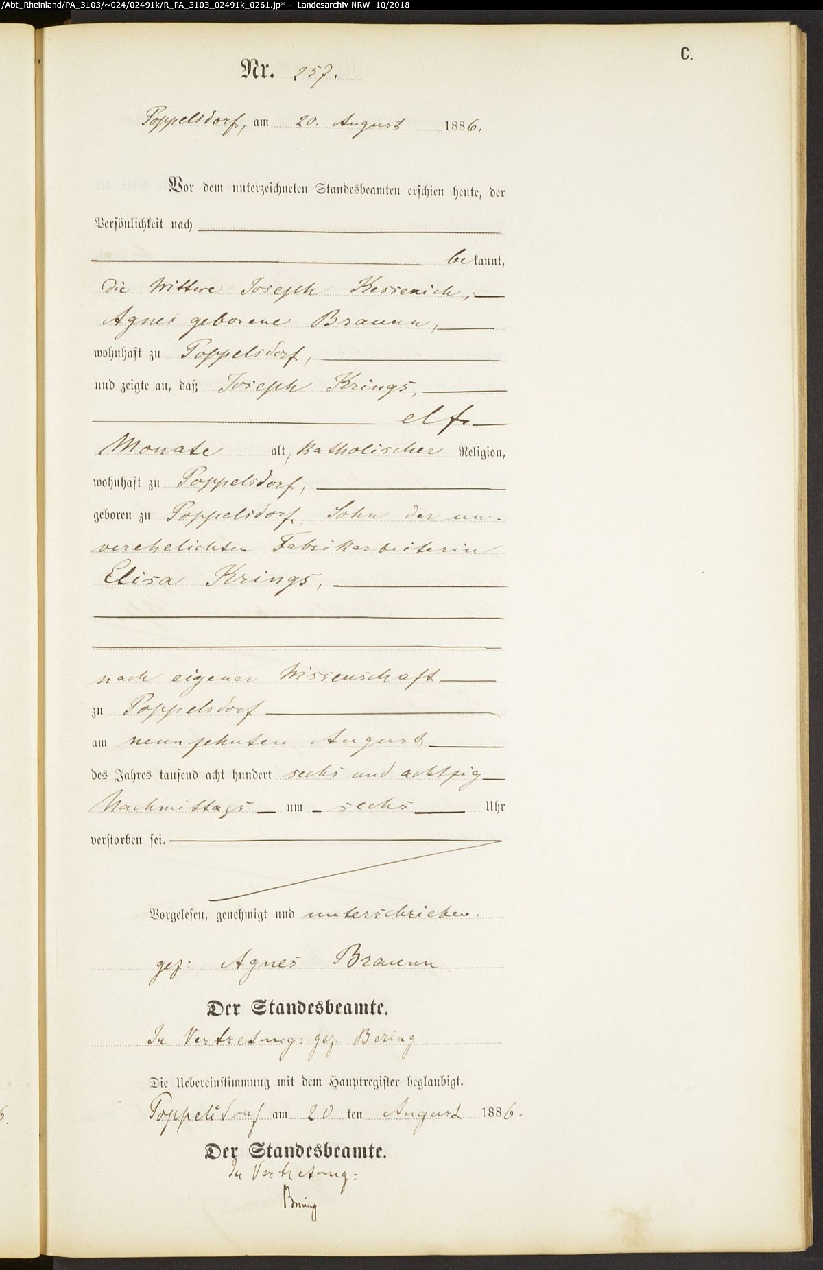 Sterbeurkunde Standesamt Poppelsdorf Nr. 257/1886