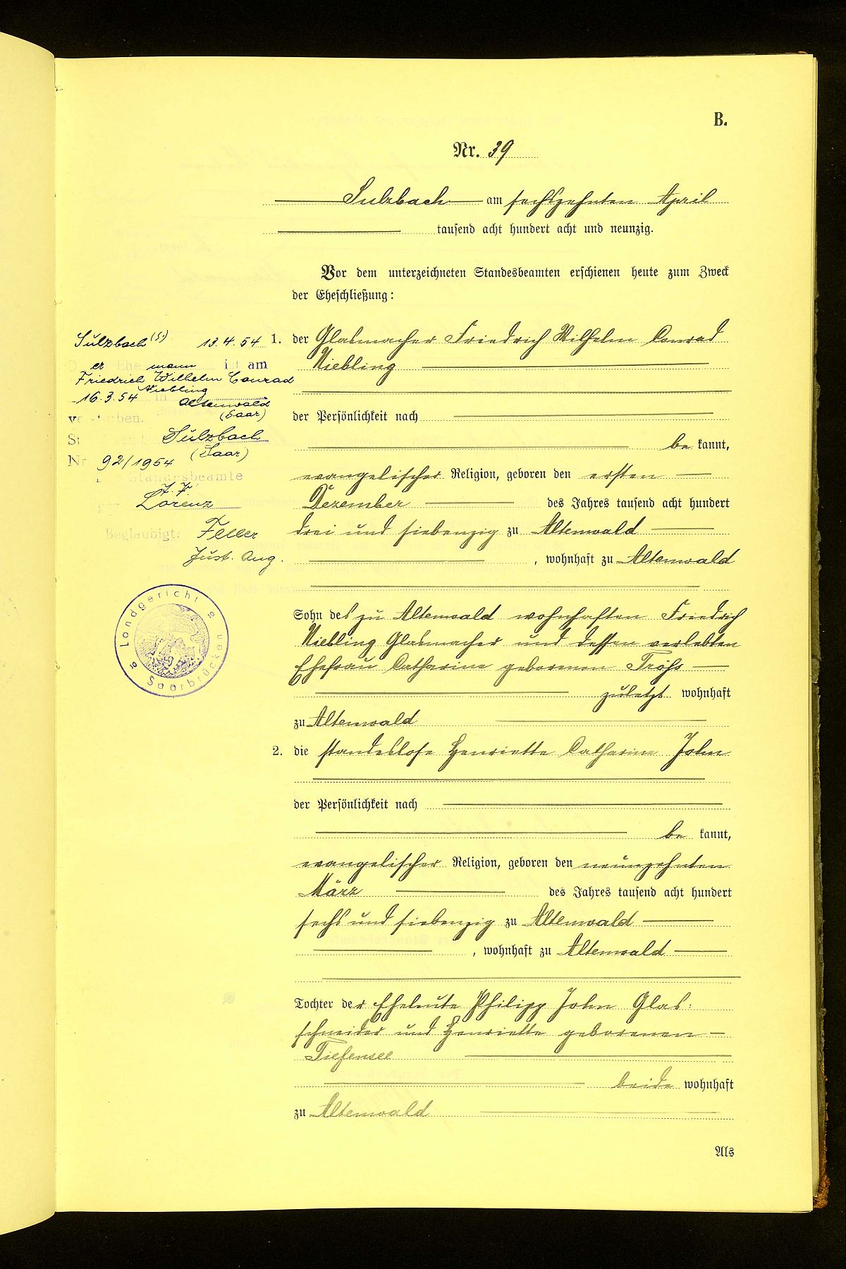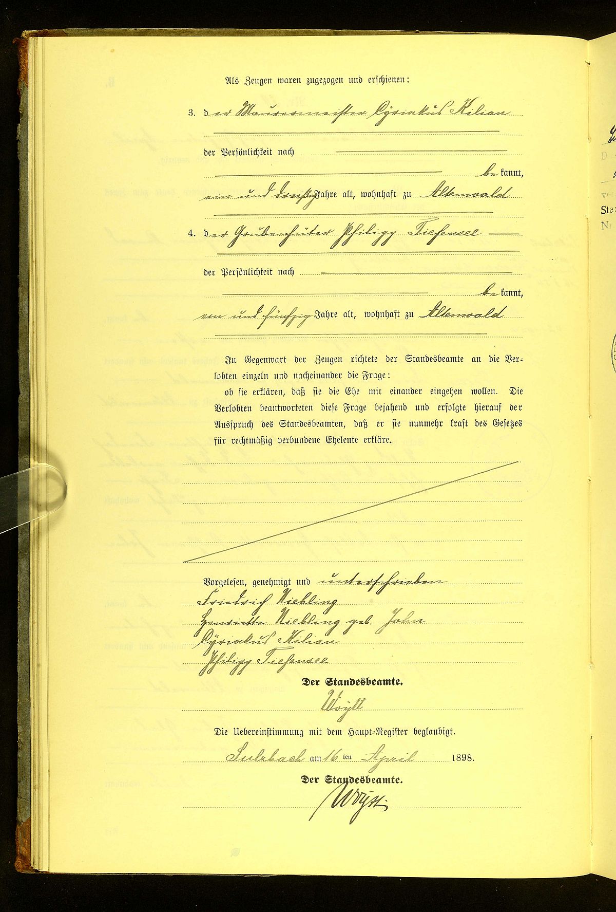 Heiratsurkunde Nr. 39/1898 Standesamt Sulzbach