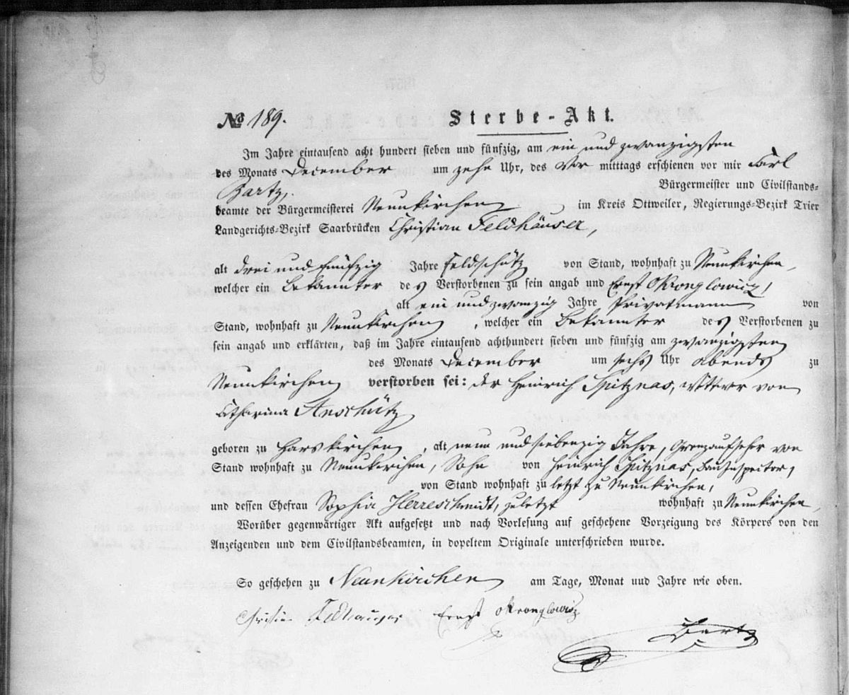 Sterbeeintrag Nr. 189/1857 des Zivilstandsregisters Neunkirchen, Kreis Ottweiler