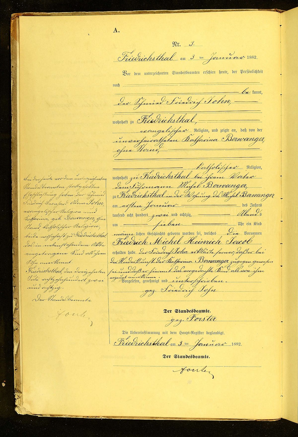 Quelle: Geburtsregister Nr. 3/1882 Standesamt Friedrichsthal
