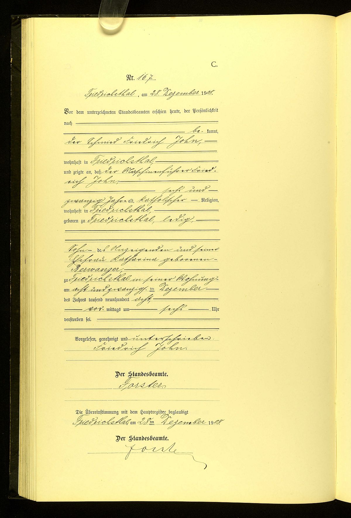 Sterberegister Nr. 167/1908 Standesamt Friedrichsthal
