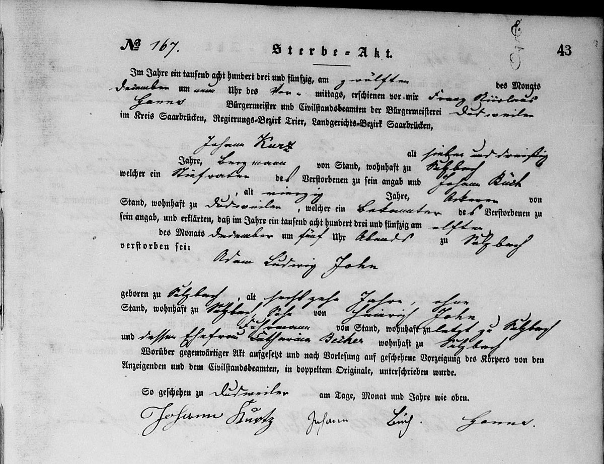 Sterbeurkunde Nr. 167/1853 Zivilstandsregister Dudweiler