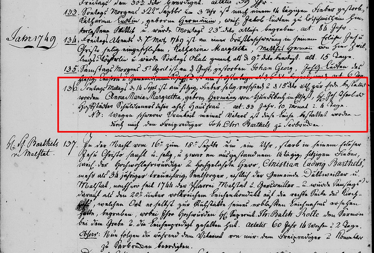 Quelle: Sterbeeintrag Nr. 136/1749 der Ev.-Kirchengemeinde Malstatt und Burbach