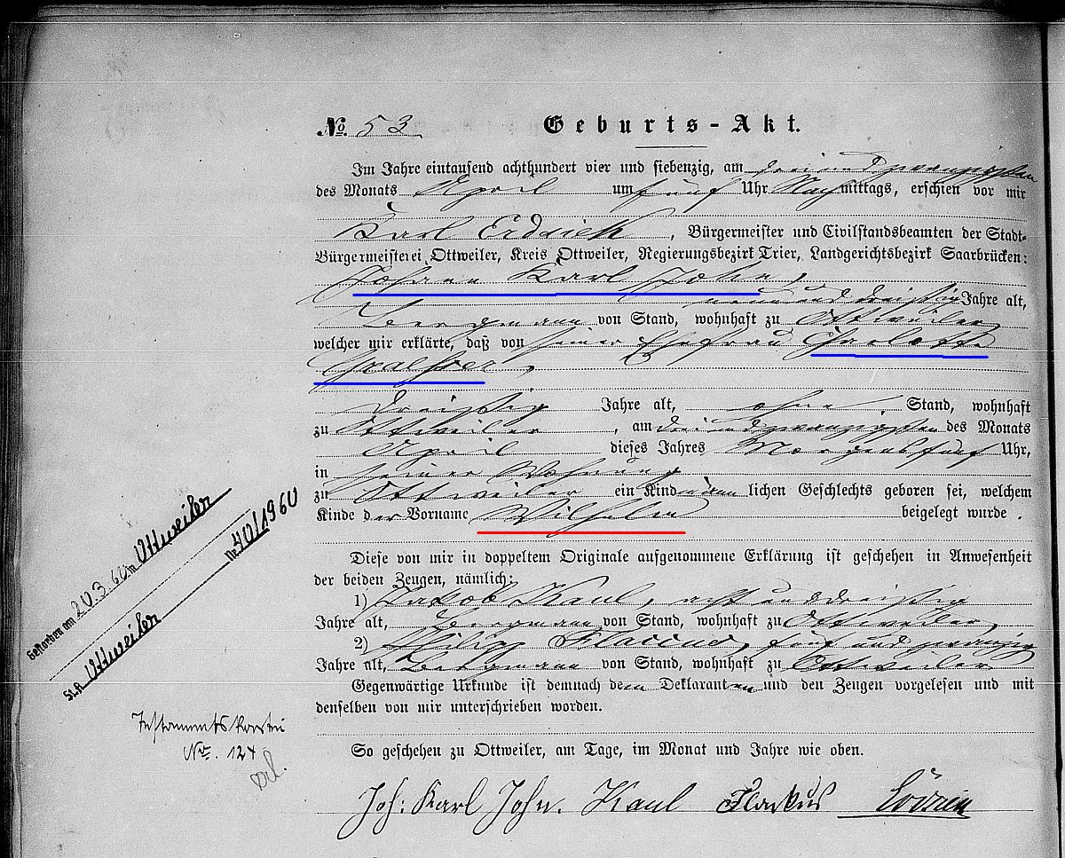Quelle: Geburtsregister Nr. 53/1874 Zivilstandsregister Ottweiler