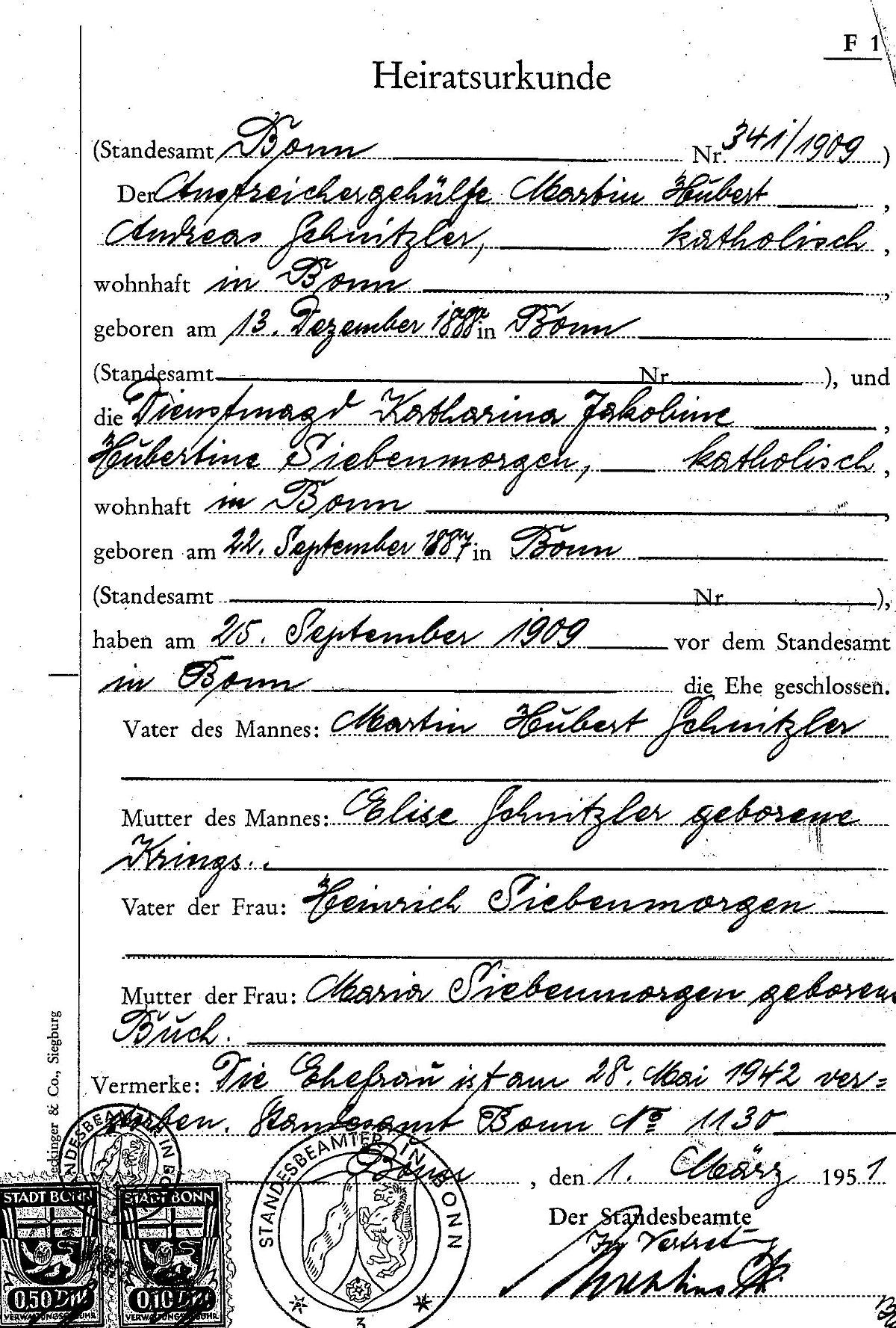 Heiratsregister Nr. 341/1909 Standesamt Bonn