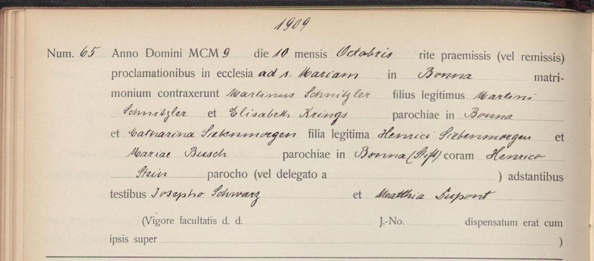 Trauung Nr. 65/1909 am 10.10.1909 in St. Marien zu Bonn durch Pfarrer Henrico Stein, Trauzeugen: Joseph Schwarz und Matthias Dupont (Küster an St. Marien)