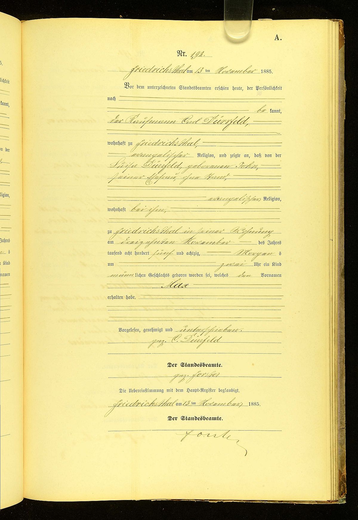 Quelle: Geburtsurkunde Nr. 192/1885 Standesamt Friedrichsthal