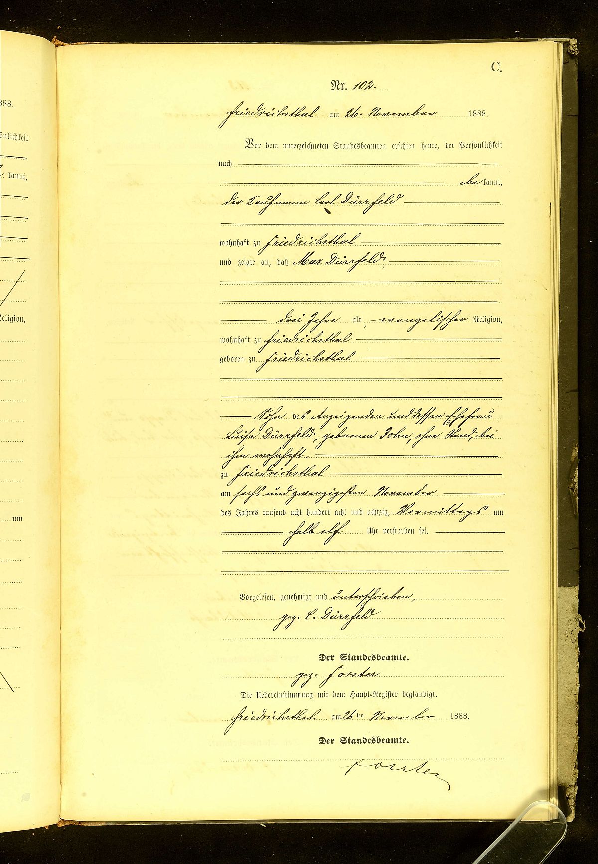 Sterbeurkunde Nr. 102/1888 Standesamt Friedrichsthal
