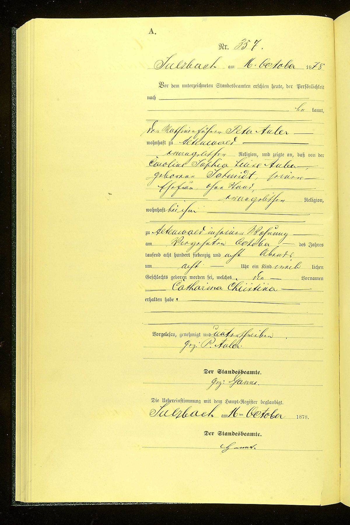 Quelle: Geburtsregister Nr. 357/1878 Standesamt Sulzbach