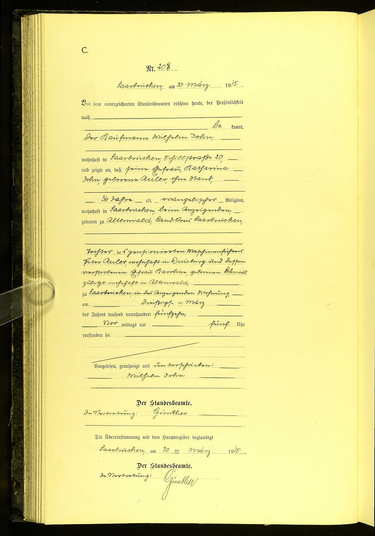 Sterberegister Nr. 208/1915 Standesamt Malstatt-Burbach