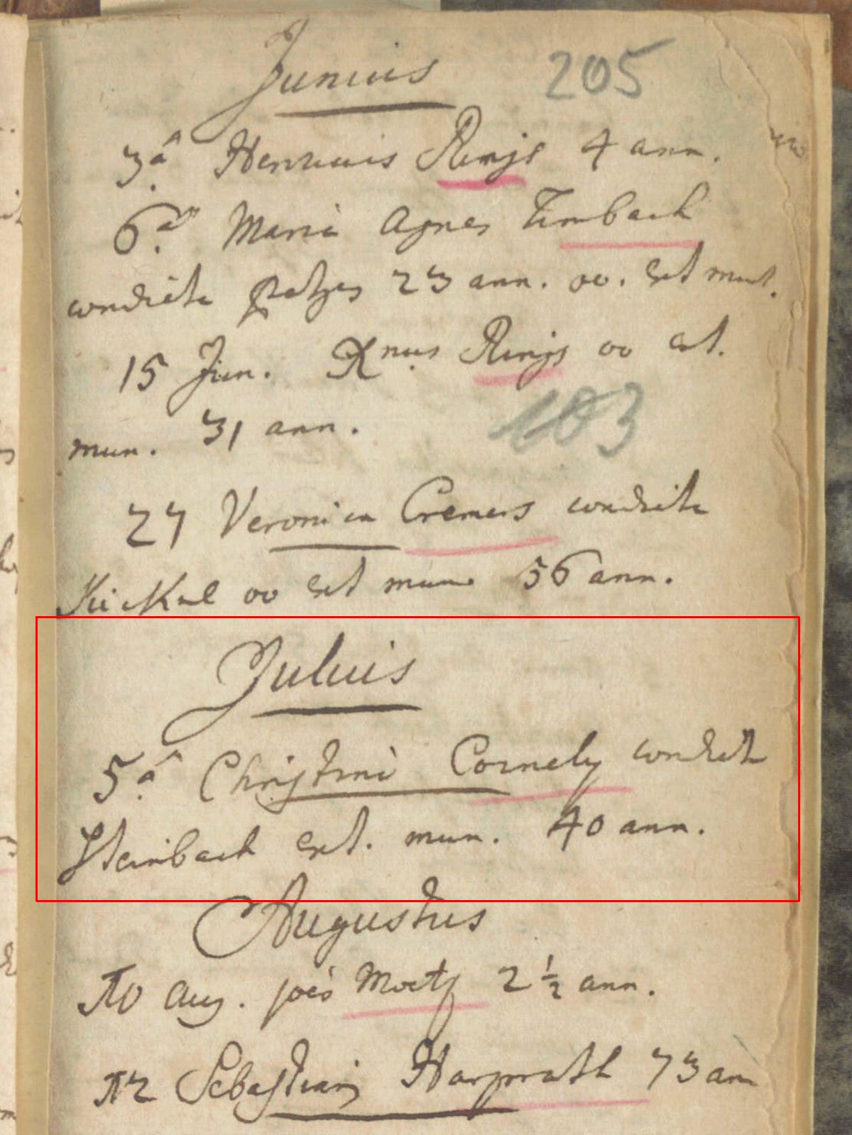 Sterbeeintrag Kirchenbuch Seite 205 des Jahres 1741 der katholischen Kirche St. Johann Baptist zu Honnef