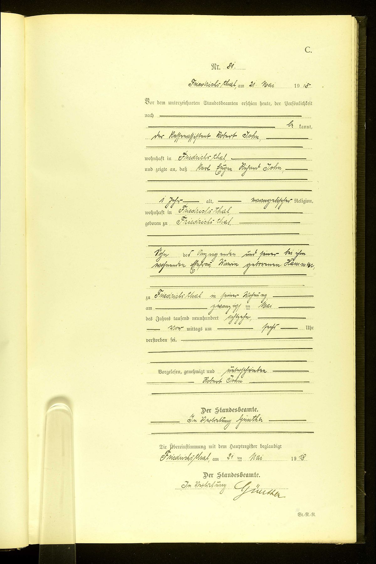 Quelle: Sterberegister Nr. 81/1918 Standeasamt Friedrichsthal