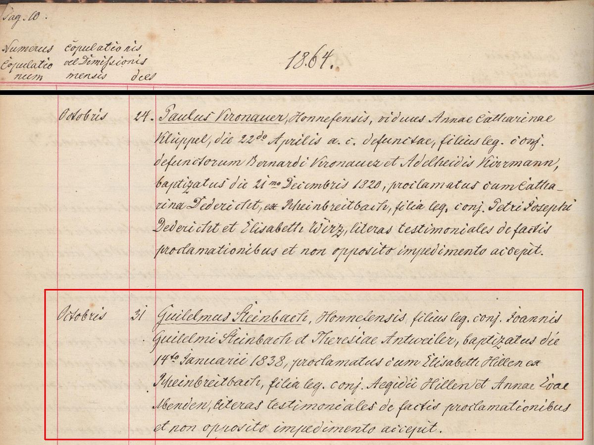 Quelle: Trauung Kirchenbuch Seite 10 des Jahres 1864 in der katholischen Kirche St. Johann Baptist zu Honnef