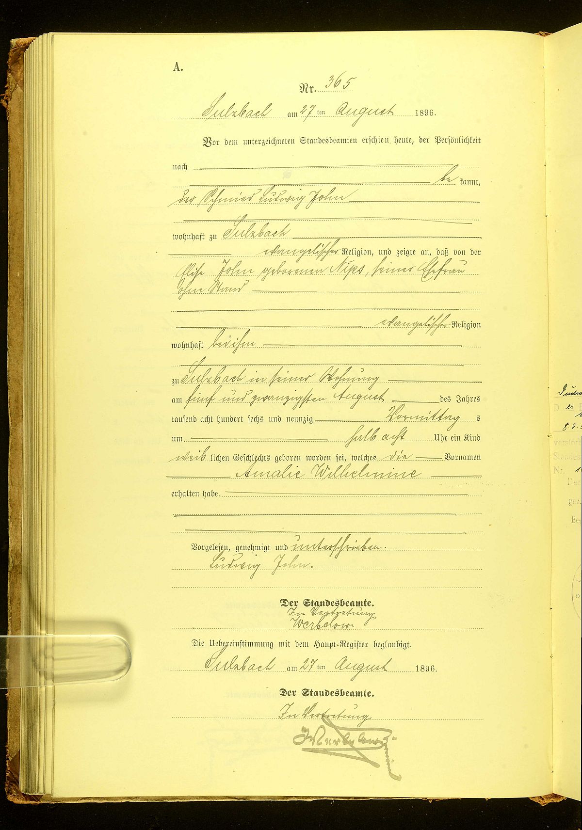 Quelle: Geburtsregister Nr. 365/1896 Standesamt Sulzbach