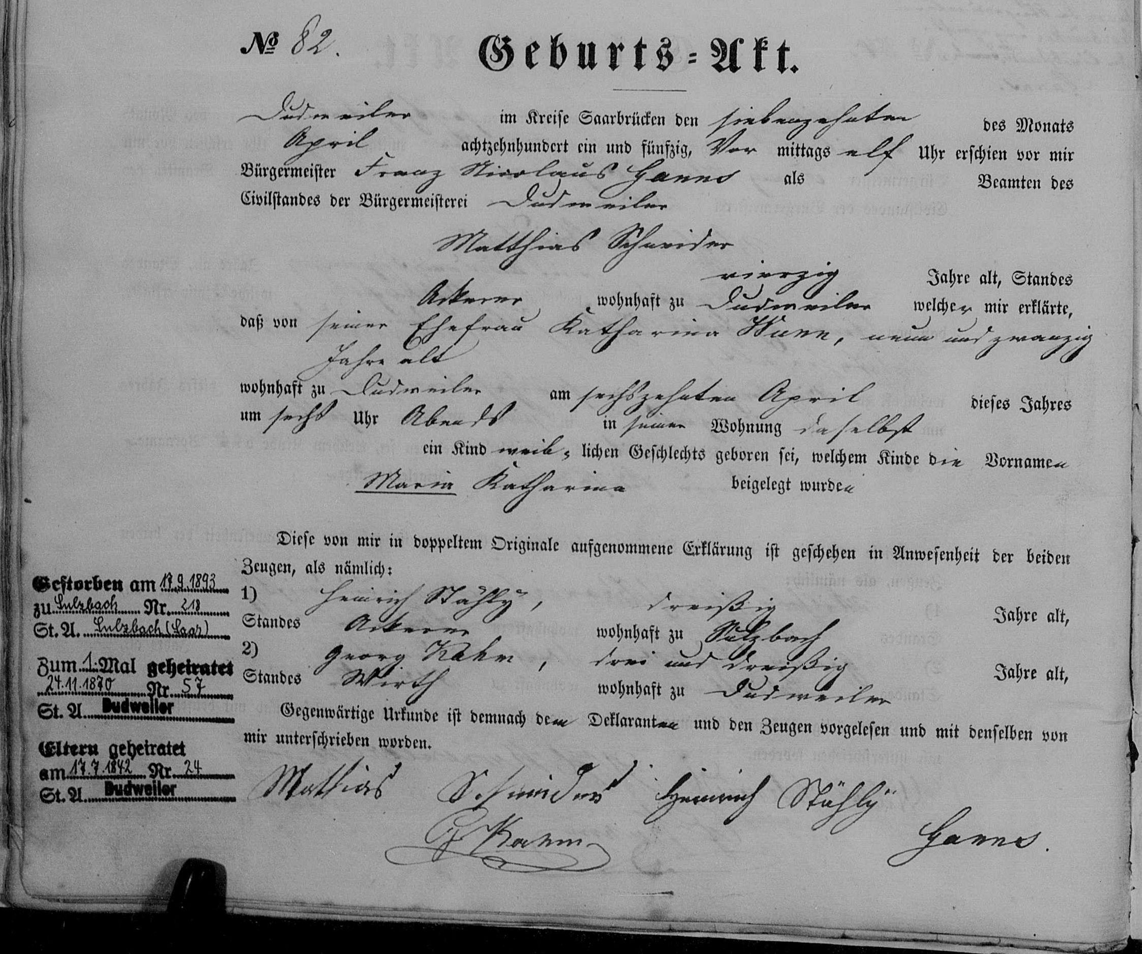 Quelle: Geburtsregister Nr. 82/1851 Zivilstandsregister Dudweiler