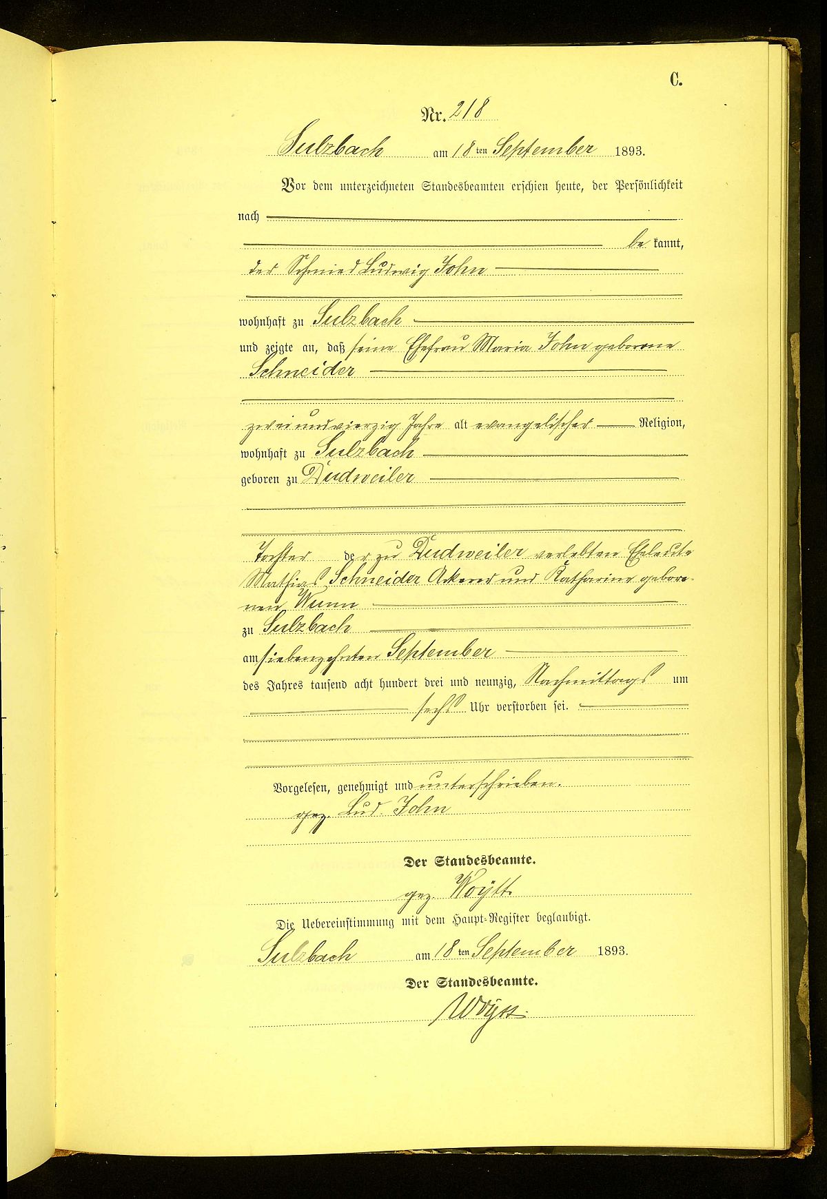 Sterberegister Nr. 218/1893 Standesamt Sulzbach