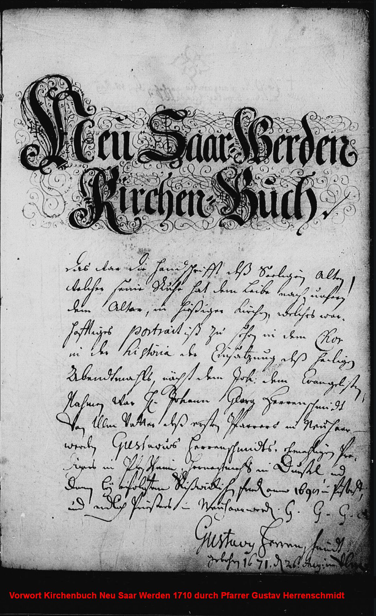 Quelle: Es wurden im Sterbebuch der ev. Kirche 1723-1736 Neu-Saarwerden 6 umfangreiche Seiten zum Leben und Tod des Pfarrers Gustav Herrenschmidt aufgeschrieben.