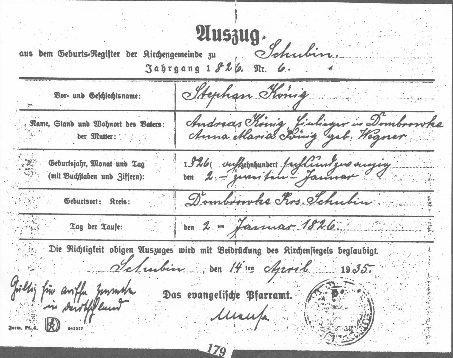 Quelle: Kirchenbucheintrag Nr. 6 der Taufe 1826 ev. Kirchengemeinde zu Schubin (heute Szubin in Polen)