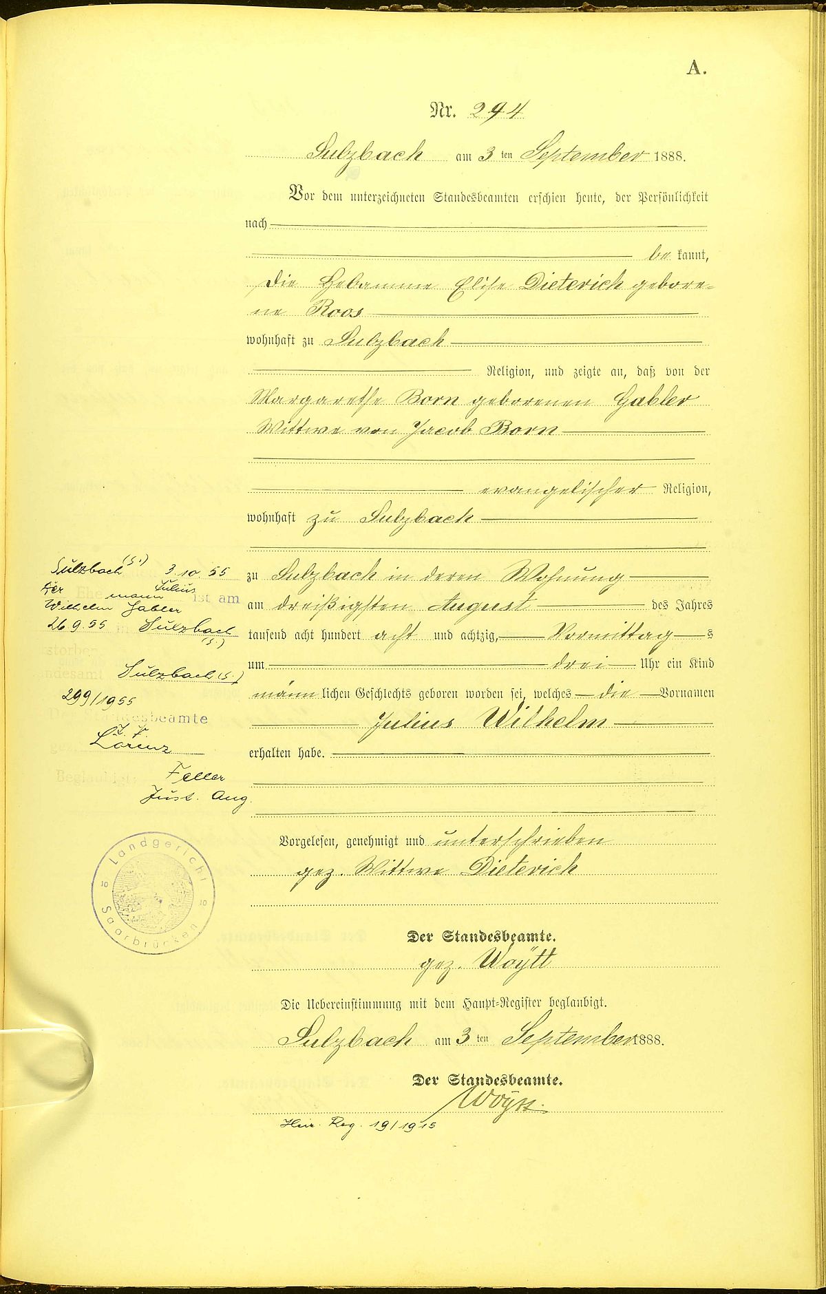 Quelle: Geburtsregister Nr. 294/1888 Standesamt Sulzbach