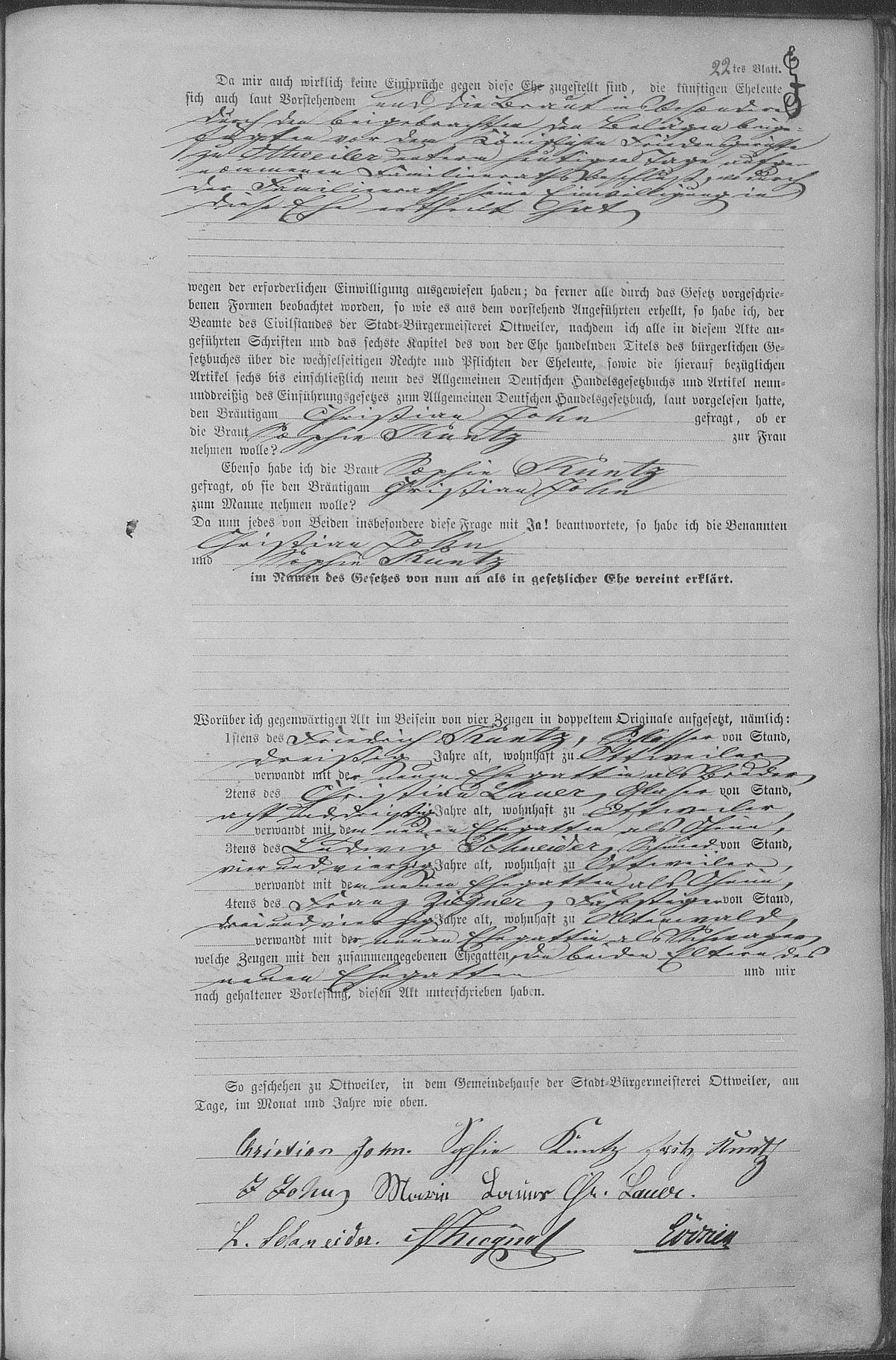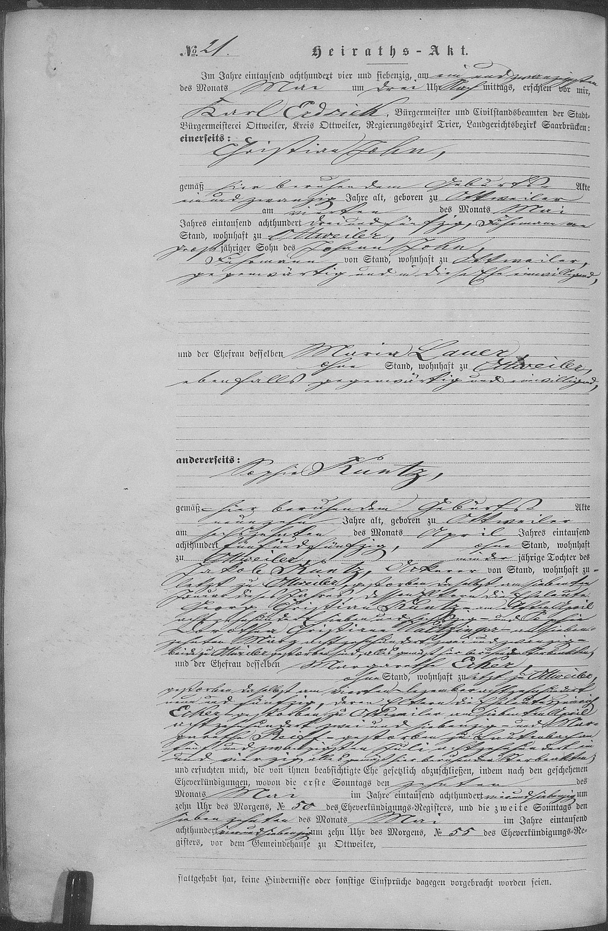 Quelle: Heiratsregister Nr. 21/1874 Zivilstandsregister Ottweiler