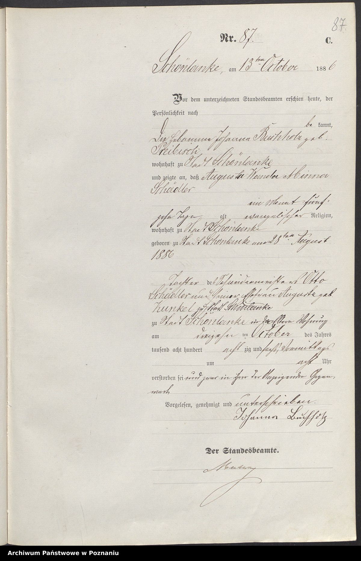 Sterbeurkunde Nr. 87/1886 Standesamt Stadt Schönlanke