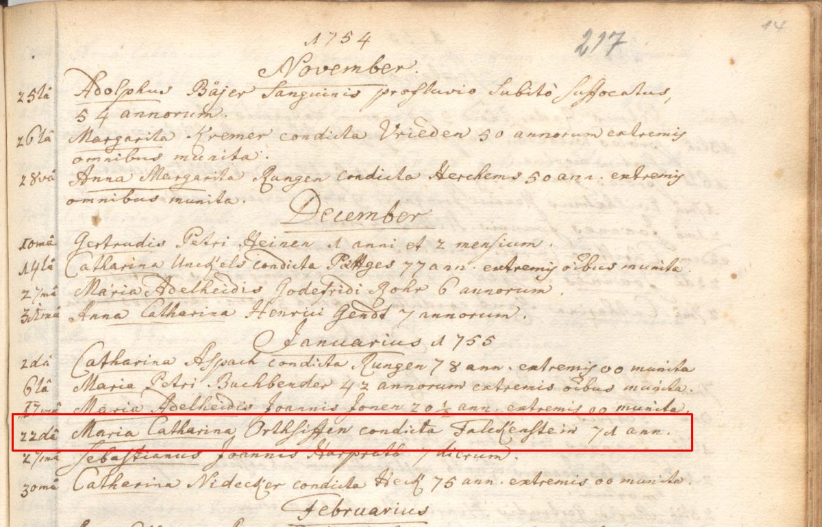 Quelle: Sterbeeintrag Kirchenbuch Seite 217 des Jahres 1755 der katholischen Kirche St. Johann Baptist zu Honnef