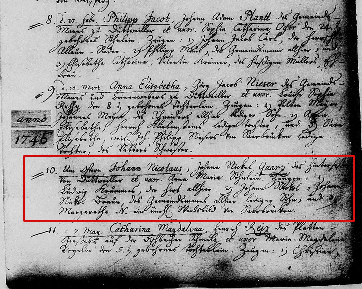 Quelle: Taufeintrag Nr. 10/1746 der Ev.-Kirchengemeinde Dudweiler und Scheidt (Ostern = 10.04.1746)
