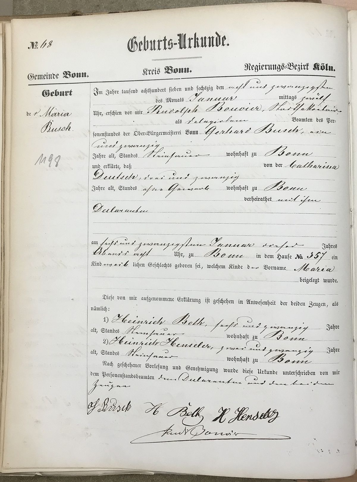Quelle: Geburtsregister Nr. 68/1867 Zivilstandsregister Bonn
