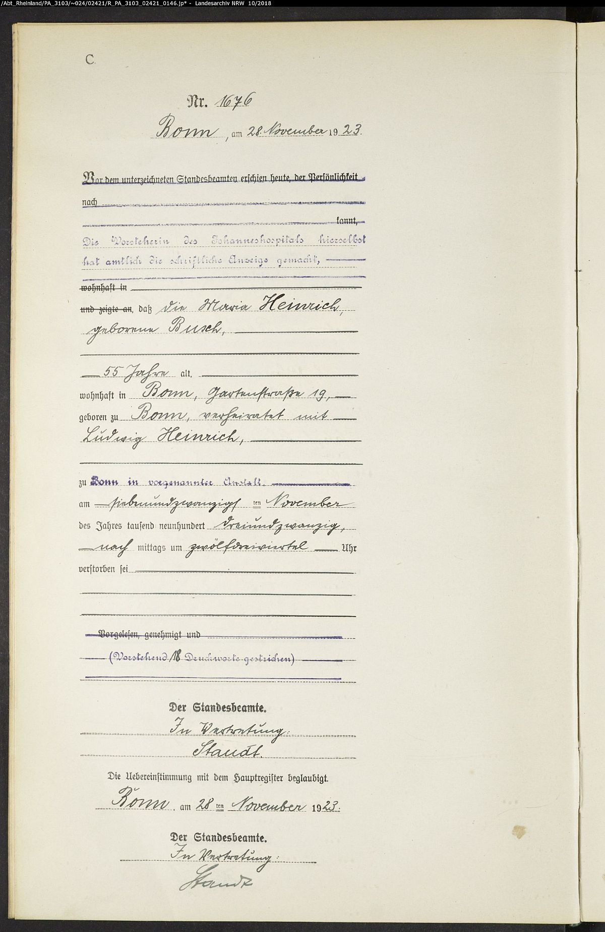 Sterberegister Nr. 1676/1923 Standesamt Bonn