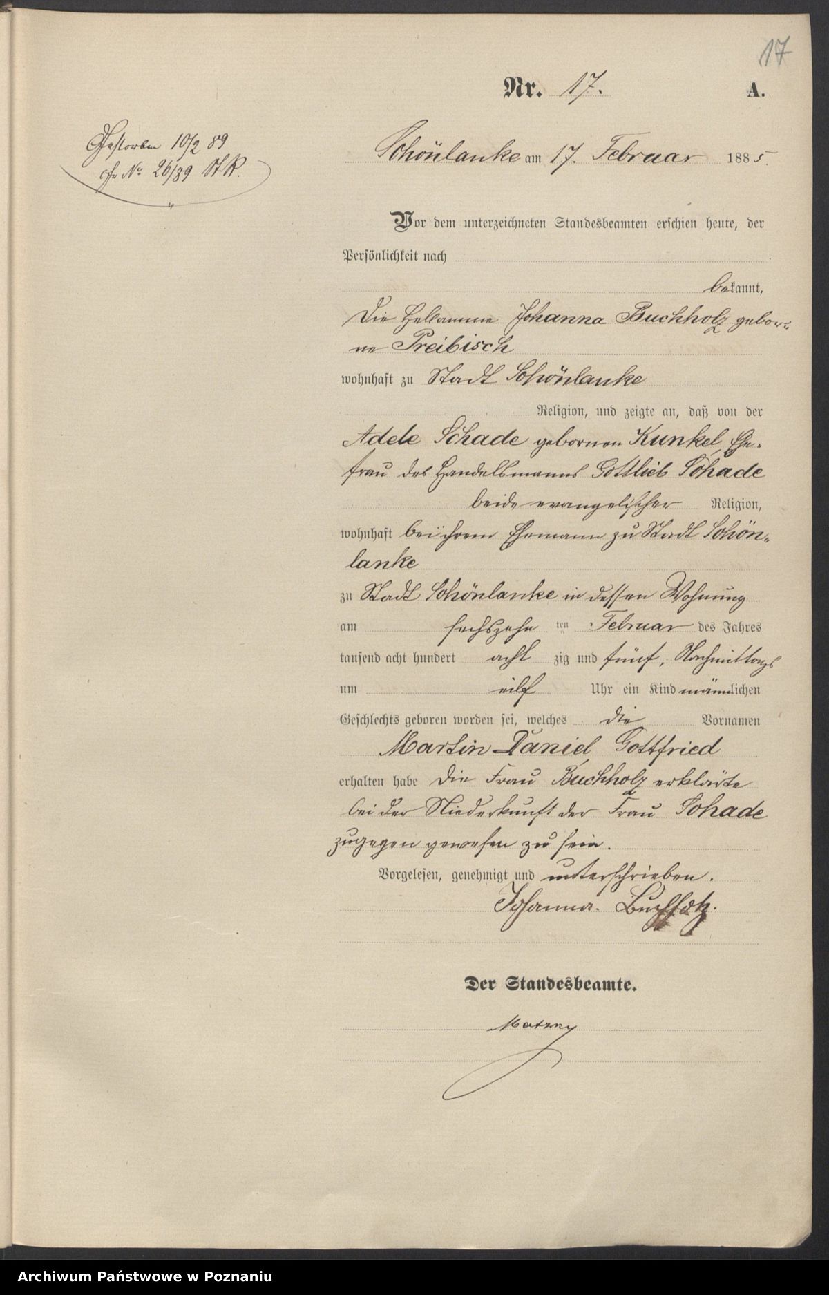 Quelle: Geburtsregister Nr. 17/1885 Standesamt Stadt Schönlanke