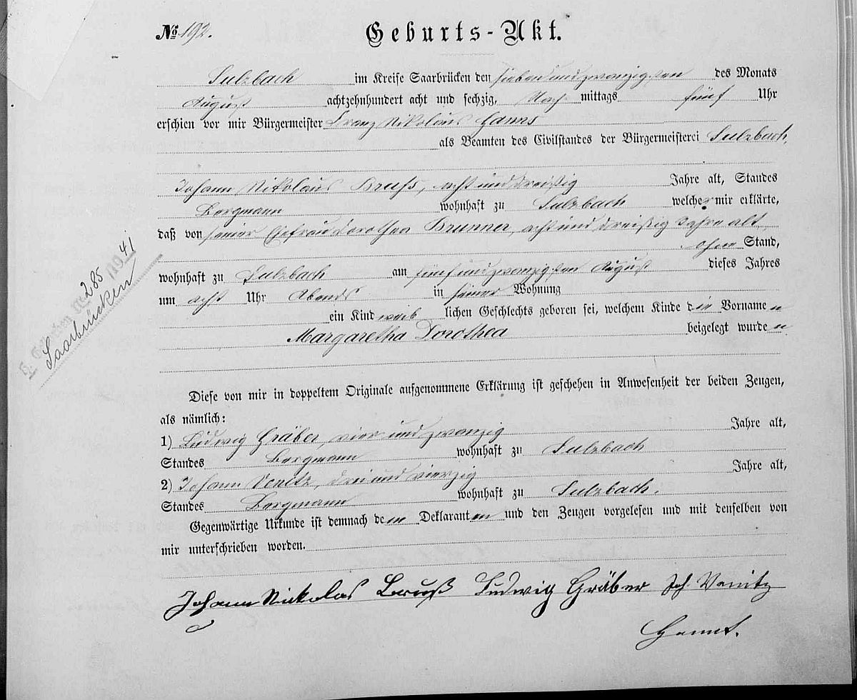 Quelle: Geburtsregister Nr. 192/1868 Zivilstandsregister Sulzbach