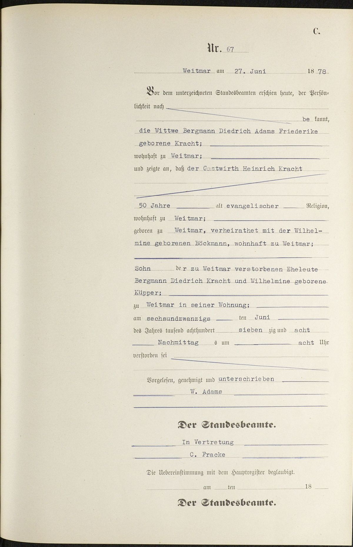 Quelle: Sterberegister Nr. 67/1878 Standesamt (Bochum-)Weitmar