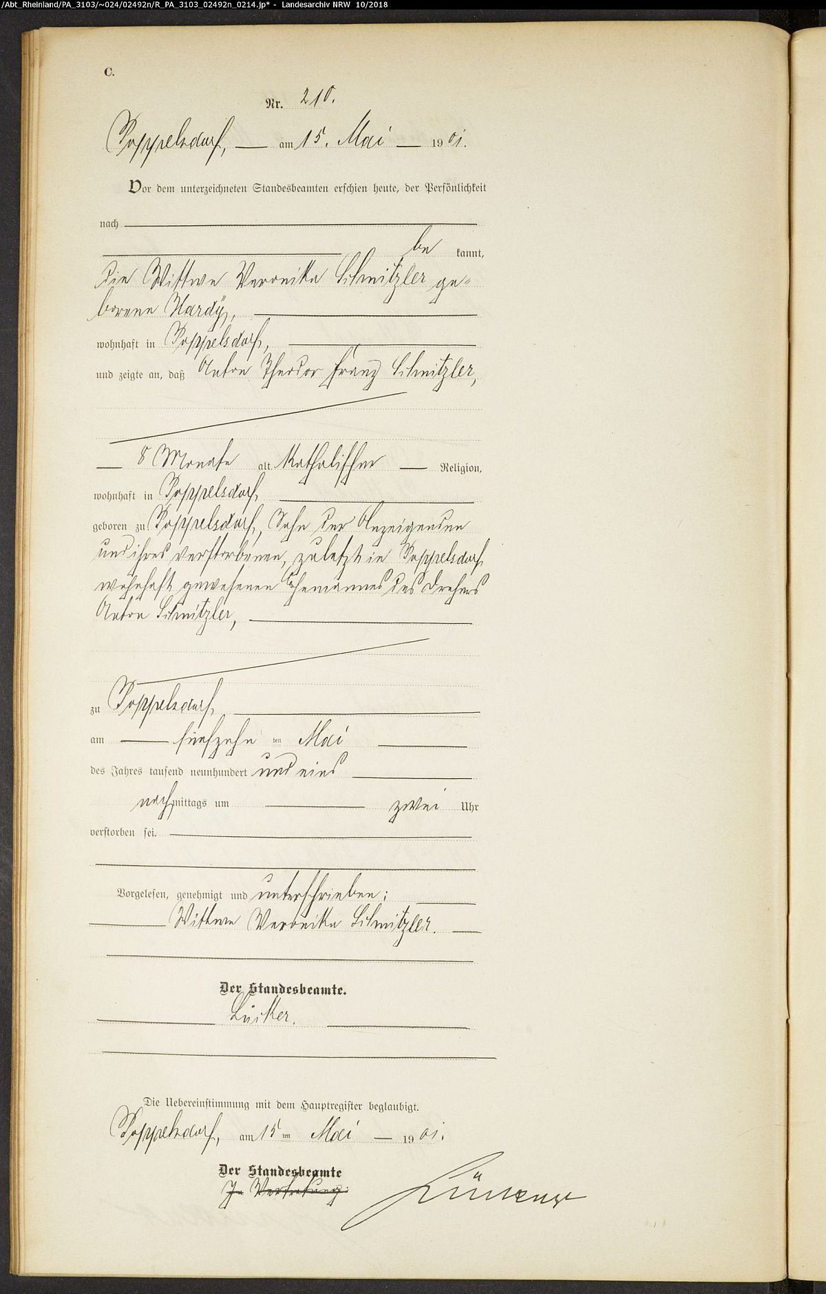 Sterberegister Nr. 210/1901 Standesamt Poppelsdorf