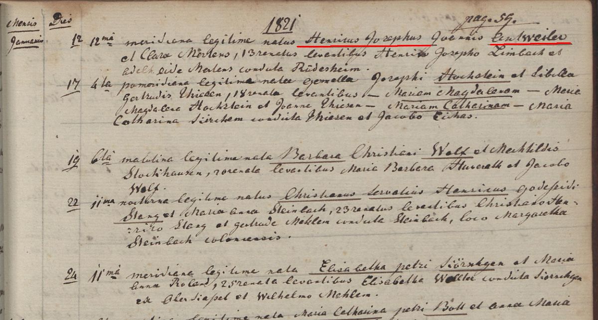 Quelle: Taufe Kirchenbuch Seite 59 des Jahres 1821 in der katholischen Kirche St. Johann Baptist zu Honnef