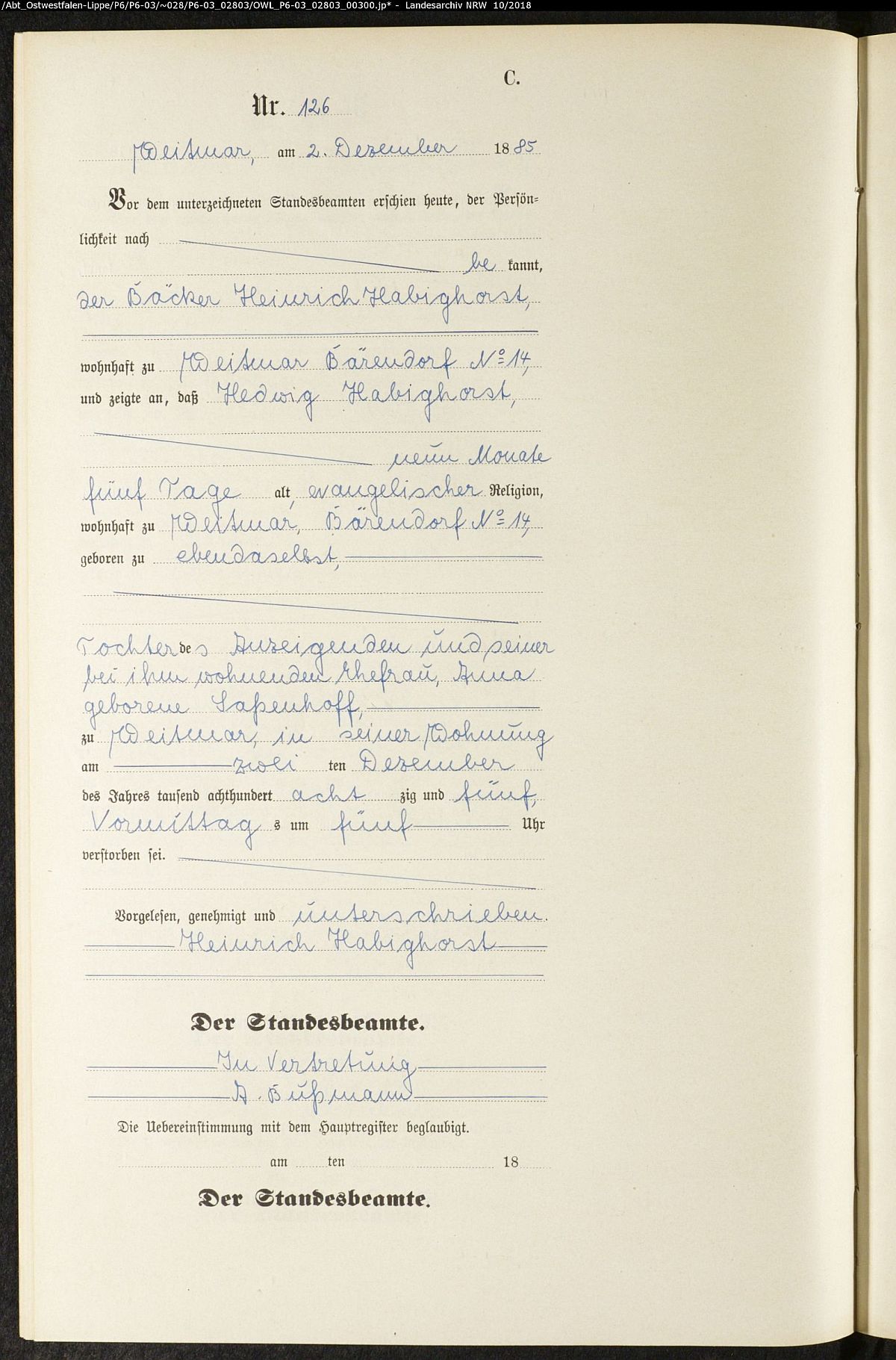 Sterbeurkunde Nr. 126/1885 Standesamt Weitmar
