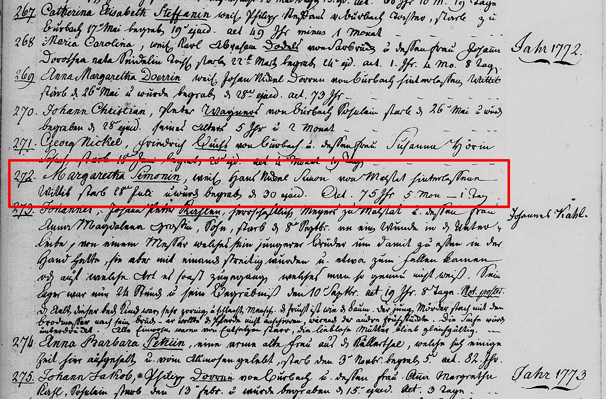 Sterbeeintrag Nr. 272/1772 der Ev.-Kirchengemeinde Malstatt und Burbach