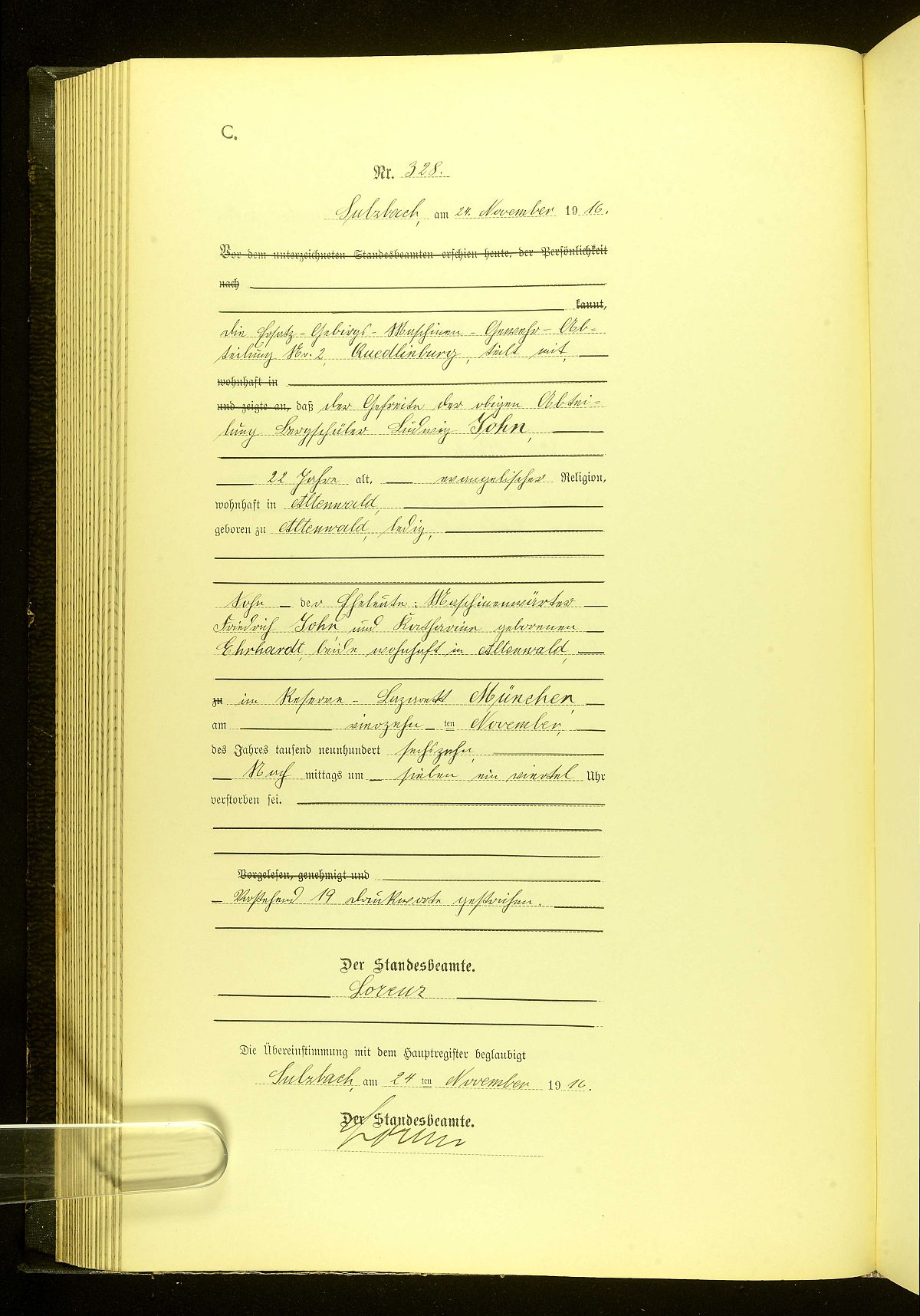 John, LudwigSoldat/Gefreiter* um 1894 Altenwald, Sulzbach+ 14.11.1916 MünchenQuelle: Sterbeurkunde Nr. 328/1916 Standesamt Sulzbach Vater:Friedrich Philipp John Mutter:Auguste Catharine Wilhelmine John geb. Ehrhardt Geschwister:Ludwig Wilhelm Herrmann John Emil Heinrich John Auguste Hedwig Dorothea John Erich Julius John Erich Friedrich John Marta Melita John Erstellt mit dem Programm AHNENBLATT (www.ahnenblatt.de).