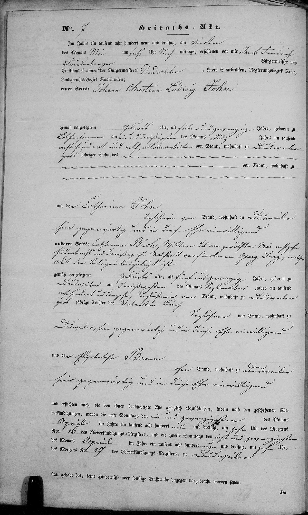 Heiratsregister Nr. 7/1839 Zivilstandsregister Dudweiler