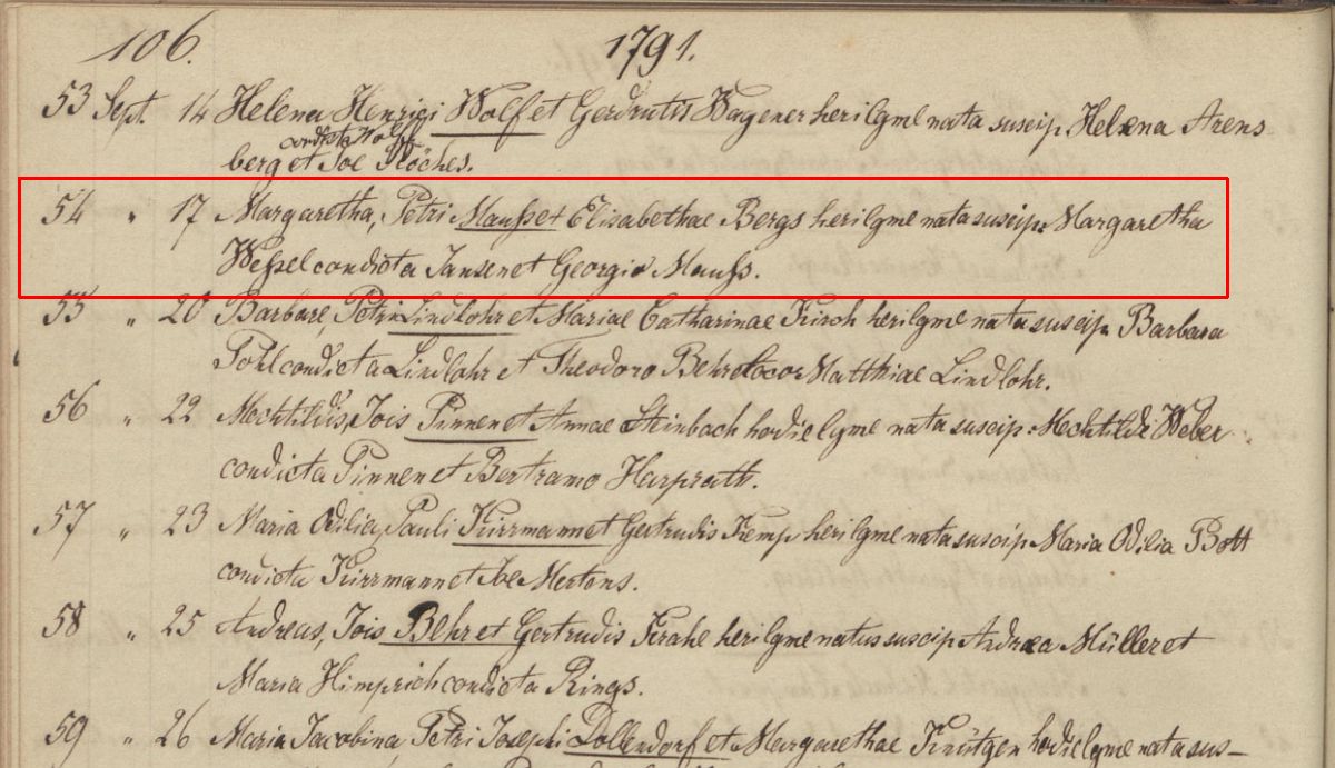 Quelle: Taufe Kirchenbuch Seite 106 des Jahres 1791 in der katholischen Kirche St. Johann Baptist zu Honnef