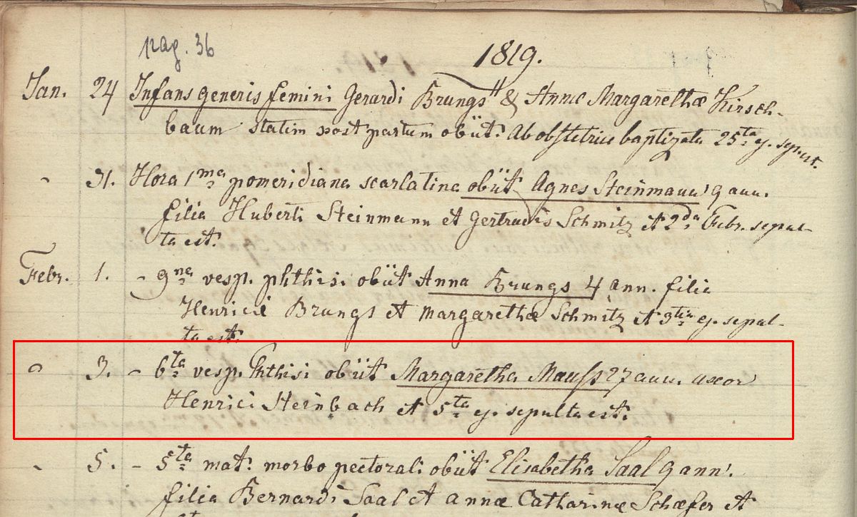 Sterbeeintrag Kirchenbuch Seite 36 des Jahres 1819 der katholischen Kirche St. Johann Baptist zu Honnef