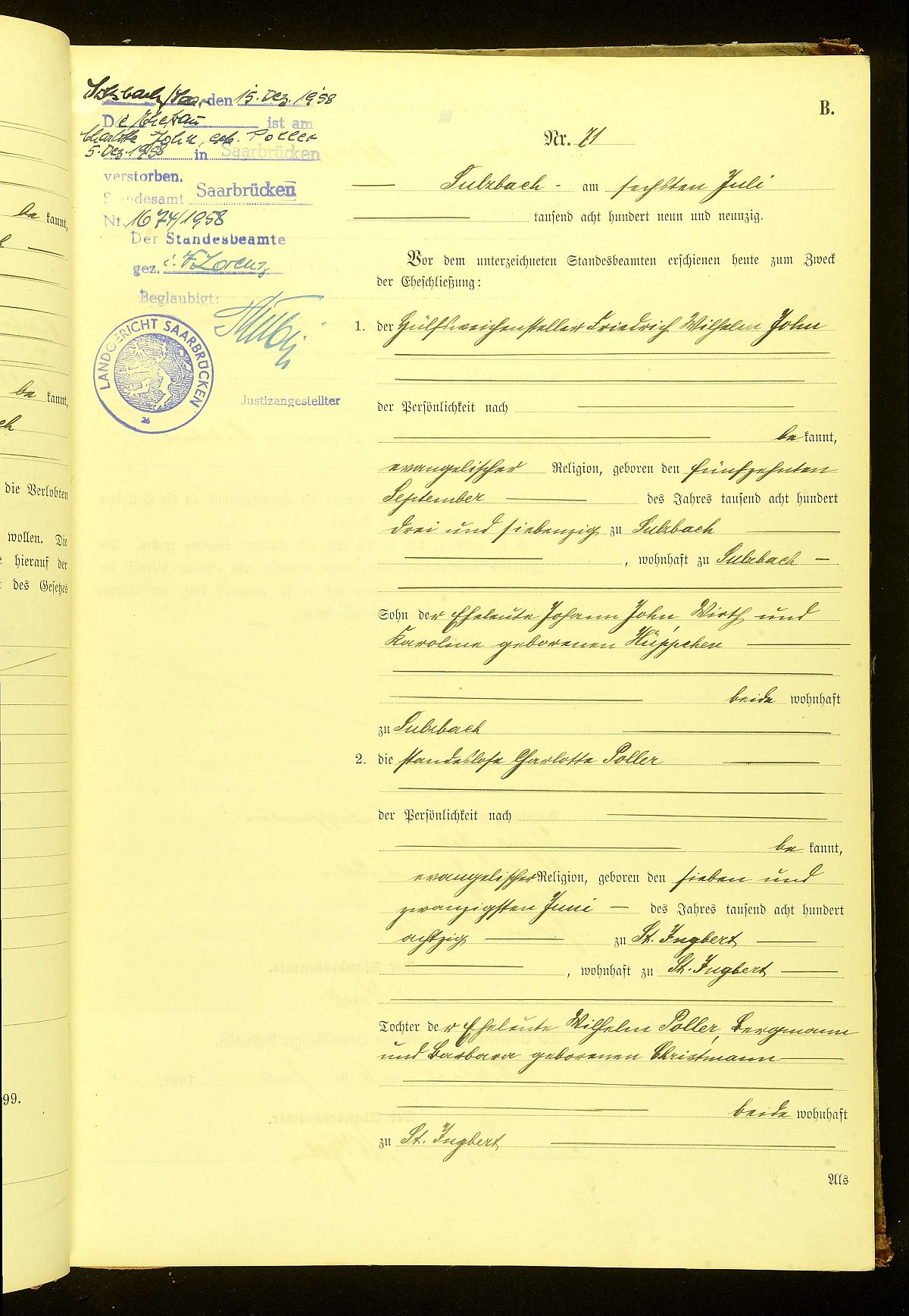 Heiratsurkunde Nr. 71/1899 Standesamt Sulzbach
