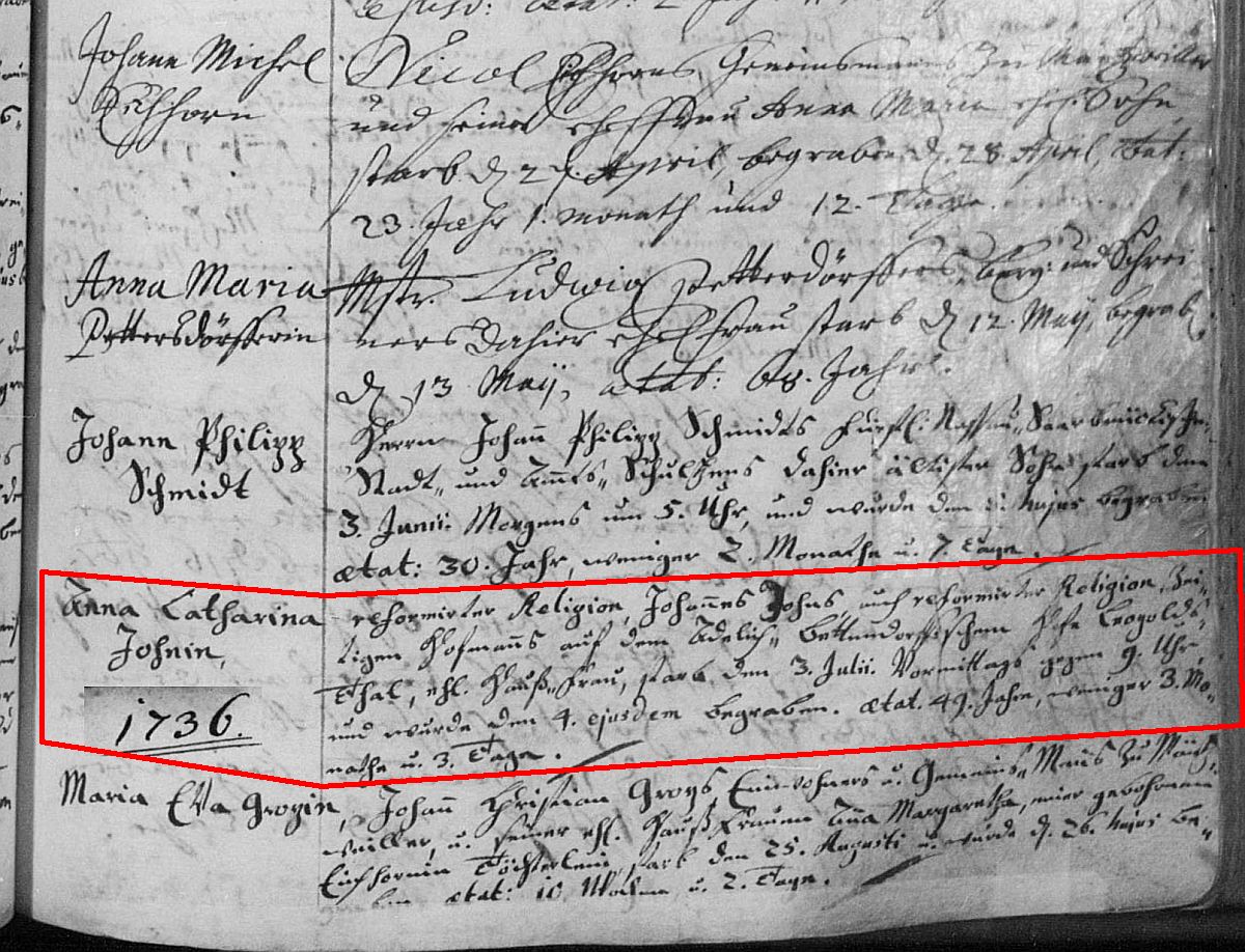 Quelle: Sterbeeintrag 1736 der Ev. Kirchengemeinde Ottweiler
