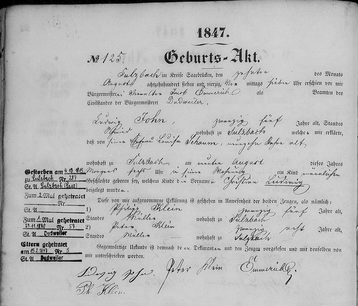 Quelle: Geburtsregister Nr. 125/1847 Zivilstandsregister Dudweiler