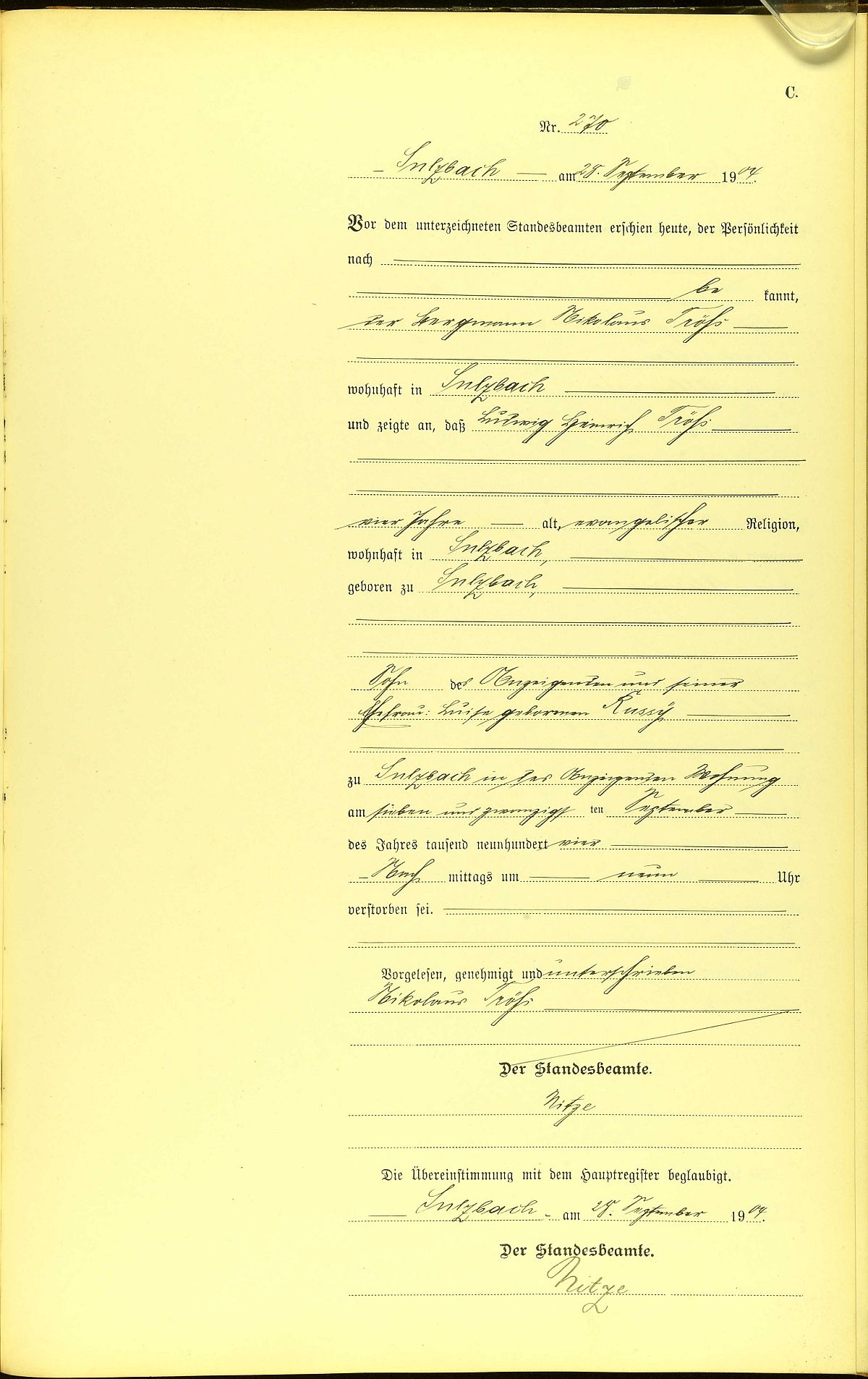 Sterberegister Nr. 270/1904 Standesamt Sulzbach