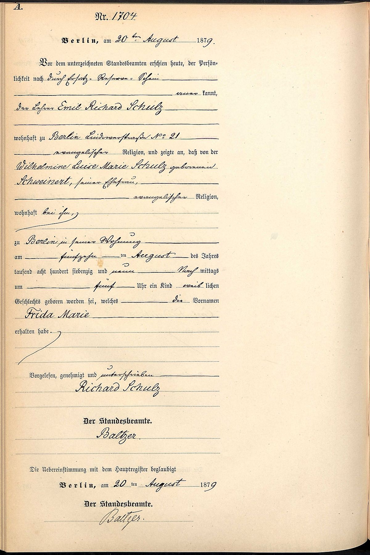 Quelle: Geburtsregister Nr. 1704/1879 Standesamt Berlin XIII