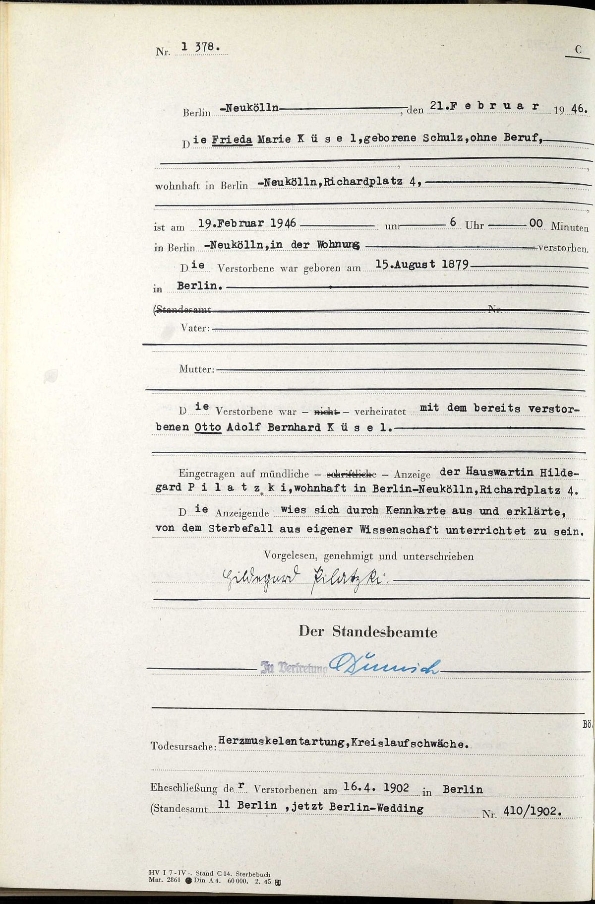 Sterberegister Nr. 1378/1945 Standesamt Neukölln