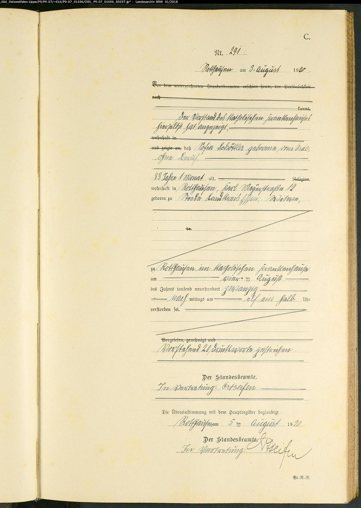 Sterberegister Gelsenkirchen 8 Rotthausen Nr. 291/1920